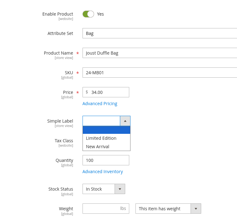 - Assign labels directly from the product edit page using a dropdown attribute: Product → Simple Label